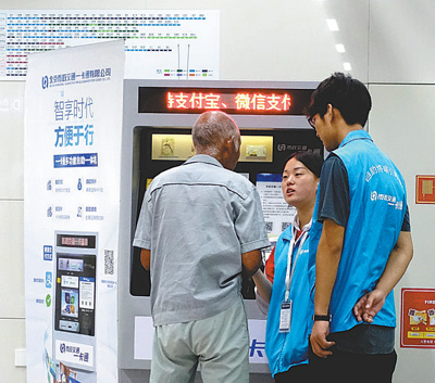 北京市政交通一卡通多功能自助机近日在北京地铁8座地铁站率先投入使用,乘客可通过该设备自助办理一卡通充值、退卡、购卡、查询业务,并可选择微信、支付宝移动支付方式。图为在地铁15号线望京东站,工作人员为用户讲解一卡通自助机操作方法。人民视觉