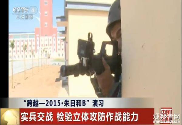 央视视频画面,注意“跨越-2015·朱日和C”演习中出现的红色5层建筑物