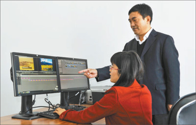 刘志怀(右一)在指导哈密职业技术学院工作人员编辑视频。陈金岭摄(人民视觉)
