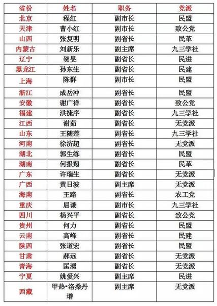 目前,在全国31个?。ㄗ灾吻?、直辖市)中,已有党外副省长(副主席、副市长)27人。具体名单如下:
