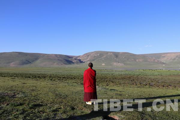 7月19日清晨,从玉树市往西北约80公里的隆宝滩边停下一个车队,一位身着绛红色僧服的年轻僧人走下车来,兴致勃勃地步向隆宝滩绿油油的草甸,身后还跟着几位着僧服的僧人。这一带属于玉树州著名的隆宝滩自然保护区,此时正处在一年中最好的季节?;饭怂闹?,一望无际的高寒草甸和湿地绿油油的,像地毯一样铺在这片海拔4200多米的高原谷地上,远处起伏的山脉像凝固的绿色波浪。