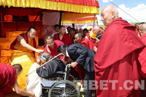 近千名僧人获得了班禅大师的摸顶赐福,僧人们按照自己心意向班禅大师献上供养和礼品,班禅大师也一一向僧人们发放布施和护身符、纪念品。