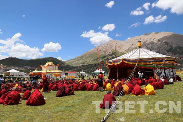 中午在贡萨寺进行简单的午休后,12点多班禅大师来到寺前的扎西滩草原,进行长寿经灌顶法会。