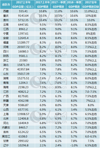 31省区市中,除北京、河北、内蒙古、吉林、黑龙江、甘肃、辽宁7省份上半年GDP同比增速低于全国水平外,21地上半年GDP增速跑赢全国,天津、山西、上海则与全国GDP增速持平,西藏、重庆和贵州分别以10.8%、10.5%和10.4%的增速领跑榜单。