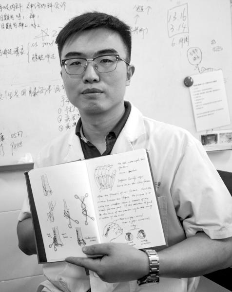 7月31日,长沙市第三医院骨科名医工作室,周伟力展示他画的手术过程图。组图/记者 陈韵骄