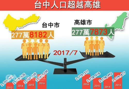 台当局“内政部”最新统计至今年7月底,台湾6个“直辖市”,人口数最多为新北市398.4051万人,台中市277.8182万人次之,其他依序为高雄市277. 7873万人、台北268.7629万人、桃园市217. 1127万人、台南市188. 6267万人。台中市人口数超越高雄市309人成为台湾人口第二多的城市。