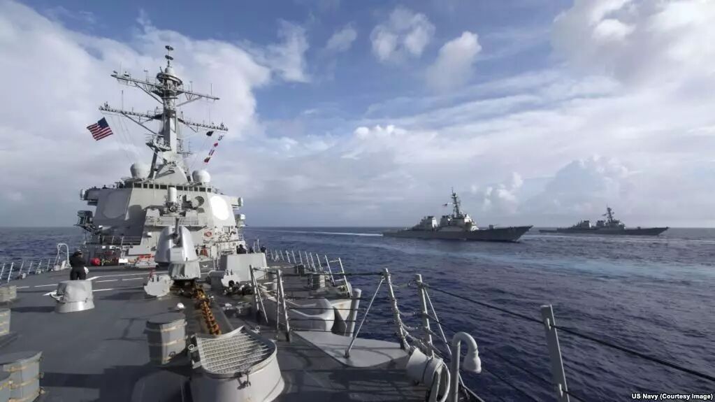 ▲资料图片:3月10日,美国海军“斯特西姆”号、“巴里”号和“菲茨杰拉德”号三艘导弹驱逐舰在菲律宾海编队航行。