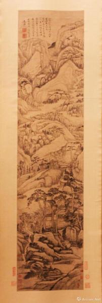 这幅画的是深山苍茫的景色,近景是坡石长松,两个隐士在松下对谈,作者多用淡墨皴擦,稍稍渲染。构图繁复幽深,山的结构呈“之”字形盘旋向上延伸,将观者的视角引向高远的山川之巅。