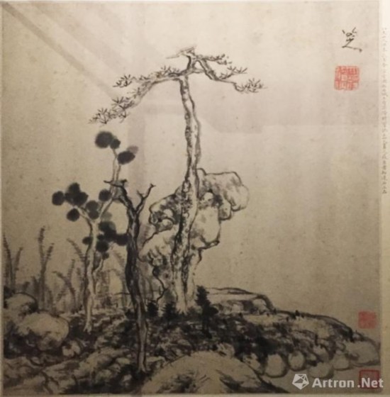 这件八大山人的图页截取了山水的一个局部,聚焦于一块石头旁边傲然挺立的孤松,略辅以坡石、杂树,更凸显出松树的孤高和不凡。画面以干笔淡墨皴染为主,笔墨纯熟老辣,天然去饰??钍稹鞍舜笊饺恕保撬砟甑淖髌?。