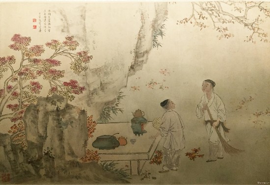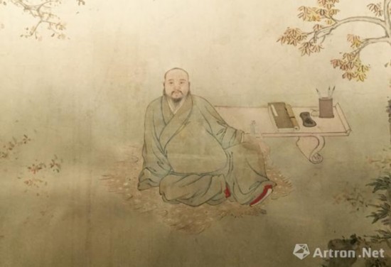 禹之鼎为别人画像不会直接就画一个坐在那里的人,不纯画肖像,他善于把人放在一个场景里。这幅画里画面中有侍者烧水沏茶、打扫。画中主人公则是正面像,神态怡然自得,手里握着佛尘,身边的几案上有文房用具,似乎是一个文人高士的身份。不过他的真实身份依然待考。