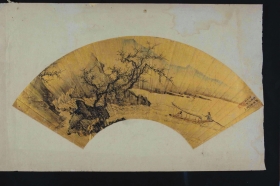 明代开始,便是一柄折扇打天下了。长沙博物馆收藏了一幅折扇扇面画《设色山水人物图》,作者是明代朱士瑛??梢韵胂蟮蹦甏蚩茸邮钡木蓿喝鹘鸬纳让嫔?,一文人泛舟水上,抬头望向飞流的瀑布,有种淡于仕进,优游山前的意境。在炎热的夏季,似有清风徐来。