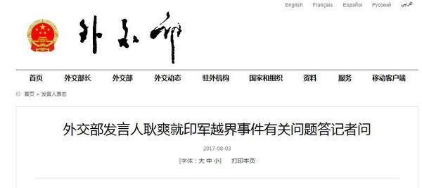 外交部网站8月3日傍晚发布了题为“外交部发言人耿爽就印军越界事件有关问题答记者问”消息表示,截至8月2日下午,印军仍有48人连同1台推土机非法滞留在中国领土上,此外还有大量武装人员集结在边界线上和边界线印方一侧。他指出,印军不论多少人员非法越界并滞留在中国境内,其性质都是对中国领土主权的严重侵犯,严重违反《联合国宪章》,构成国际不法行为,印方应为此承担相应的责任。并称,印度方面的所作所为“绝不是为了和平”。