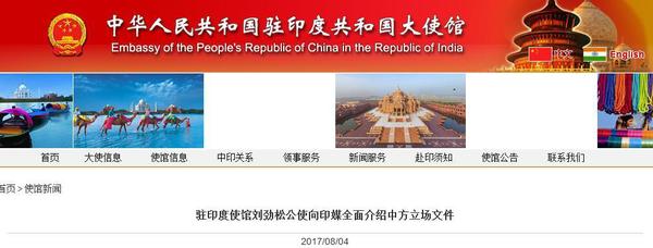 据中国驻印度大使馆官网8月4日凌晨消息,8月3日,中国驻印度使馆刘劲松公使在使馆向《印度教徒报》、《新印度时报》、《亚洲世纪报》、《德干先驱报》和“火线”网站记者吹风并答问,全面介绍8月2日中国外交部发表的《印度边防部队在中印边界锡金段越界进入中国领土的事实和中国的立场》,并回答记者相关提问。中方必须再次敦促印方立即无条件撤出越界边防部队,敦促印方不要低估中国政府和人民捍卫领土主权的决心。