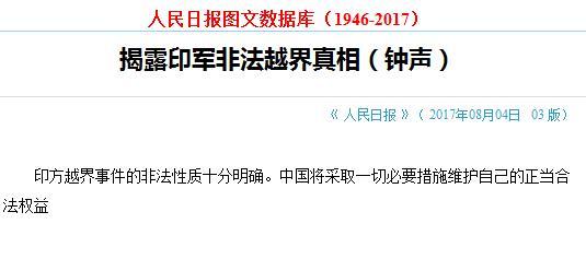 《人民日报》8月4日凌晨发表“钟声”题为“揭露印军非法越界真相”的评论文章称,何国家都不应低估中国政府和人民捍卫领土主权的决心,中国将采取一切必要措施维护自己的正当合法权益。