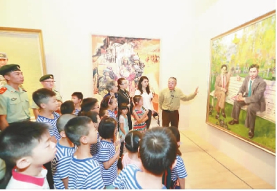 中国美协副主席李翔为孩子们和指战员讲解艺术作品