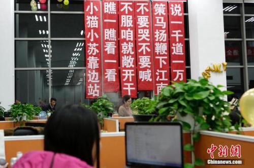 资料图:北京京东新总部大厦内,各式各样为员工打气、向对手(天猫、苏宁)叫板的条幅悬挂在员工办公区域两侧。中新社记者 李慧思 摄