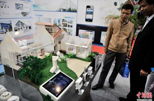 资料图:两名观众在观看智能家居控制系统的应用模型。中新社发 佟郁 摄