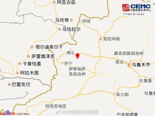 据国家地震台网官方微博消息,本次地震震中距精河县37公里、距尼勒克县61公里、距博乐市93公里、距新源县98公里、距巩留县102公里,距双河市77公里,距乌鲁木齐市383公里。