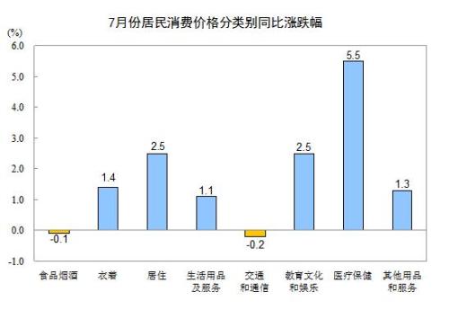7月份,其他七大类价格同比六涨一降。其中,医疗保健价格上涨5.5%,居住、教育文化和娱乐价格均上涨2.5%,衣着、其他用品和服务、生活用品及服务价格分别上涨1.4%、1.3%和1.1%;交通和通信价格下降0.2%。