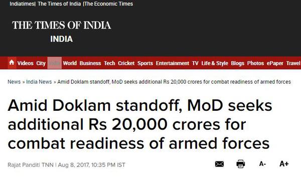 “今日印度”网站8日在题为“国防部想要额外的2000亿卢比预算以达到战争准备状态”的文章中,也对上述内容进行了报道。该报道还指出,国防部提出追加拨款的请求正值中印军队在洞朗地区对峙进入第8周之际,也正值印巴边界持续不稳定之际。