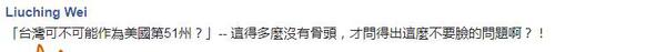对此,台湾网友表示,“美国的第51州?是哪个智障问的”,“台独真是垃圾,这种自贬身价的问题也说的出口?”,“作为美国第51州?是想要再一次被殖民,如这般无知,台湾人的悲哀是生世无法摆脱的!”,“这得多么没有骨头”,“听见绿玻璃破碎的声音”。