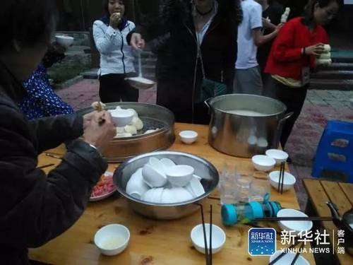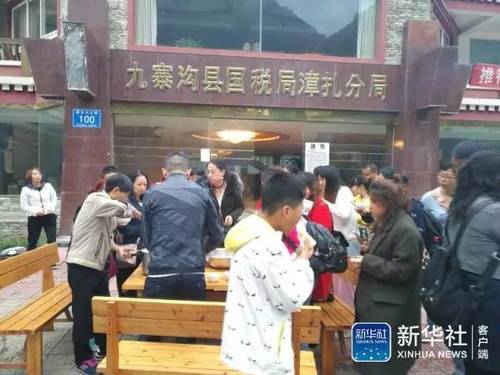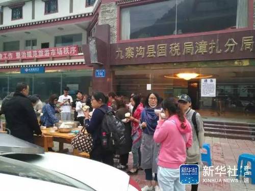 9日一早,位于九寨沟景区的沟口漳扎国税分局为游客准备了免费早餐,有稀饭、馒头、泡菜等,为受惊吓的游客尤其是老人妇女儿童送上一份温暖。(廖霞健 摄)