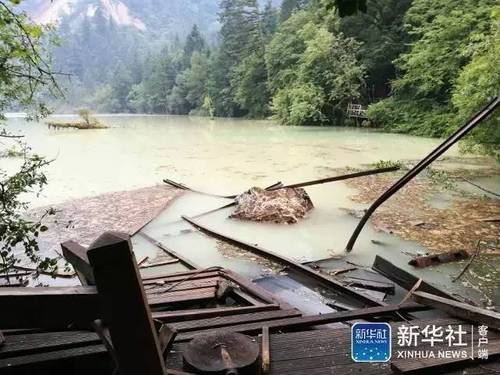 九寨沟景区景点五花海,可以看到旅游设施受损,山体有垮塌。(桑吉摄)