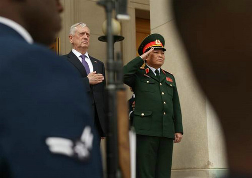 资料图片:美国国防部长马蒂斯(左)与来访的越南防长吴春历(右)。(美联社)