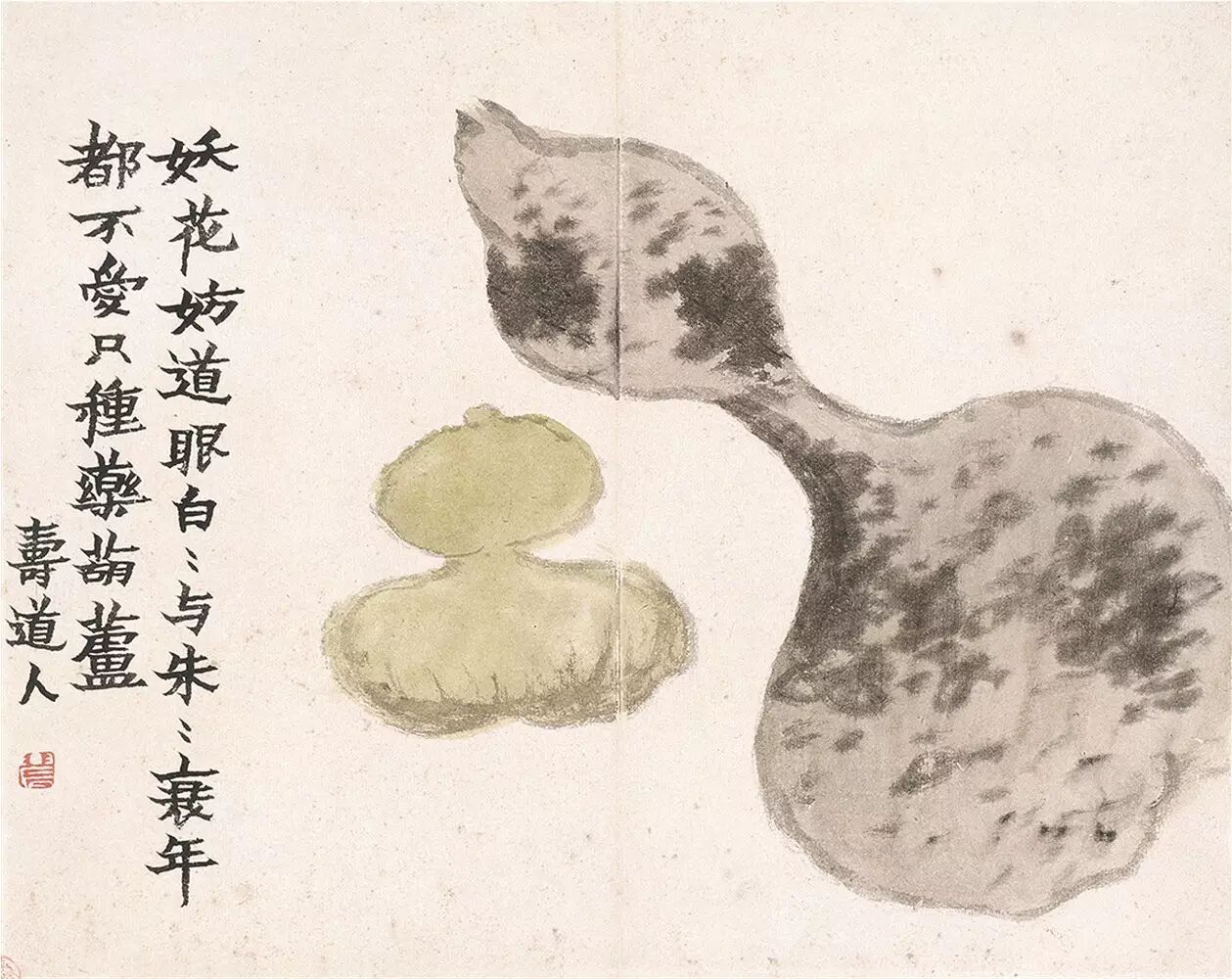 晚清民国以降,以吴昌硕、齐白石为代表的画家将葫芦题材的绘画发挥到极致。他们不仅将葫芦作为绘画本体来描绘,更赋予葫芦多重文化内涵,这就使得一个极为小众的绘画科目升堂入室,引起美术史学者的垂注。
