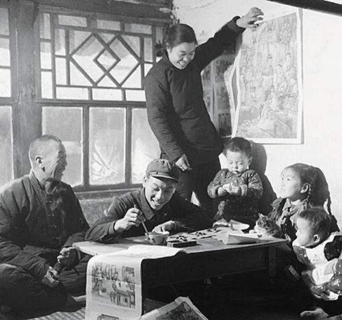 “爆竹声中一岁除,春风送暖入屠苏。千门万户曈曈日,总把新桃换旧符”。过年时,家家要购买年画、贴对联。我收藏的《写对联》的照片很好地诠释了这一主题:炕上放着方桌,一家人围着“秀才”,看他当场写对联。红红的对联贴在了大门外,泛着油墨香的年画贴了墙,家里家外,因这几处点缀而顿时变得年味十足,生机勃勃!