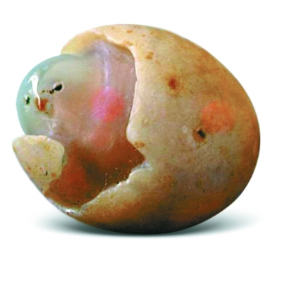 张靖后来才知道,这个地方是玛瑙湖,他们采集到的小石头大部分是玛瑙。张靖将这些玛瑙运往北京,准备和北京玉器厂合作。他们在玉器厂旁边的京玉旅馆住下,旅馆里有北京玉器厂的宣传画册,展示了历年来厂里获奖的作品,其中一件黄玛瑙作品——王树生雕刻的《雏鸡》惟妙惟肖,一下子引起了张靖的注意。他开始琢磨,在戈壁滩捡到的玛瑙蛋里有没有天然形成的小鸡呢?于是,张靖拿着手电筒,一块块地查看。功夫不负有心人,他终于有了惊喜地发现,在光照下,可以看到一只玛瑙蛋里面真的有只小鸡。张靖小心翼翼地将玛瑙皮壳打破,落出了雏鸡的头来,小鸡一双乌黑的眼睛和细嫩的红嘴栩栩如生,虽是天造,胜似人做。