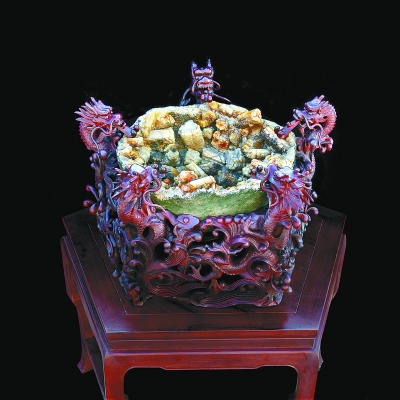 一块50多斤重、产于内蒙古玛瑙湖的形似盆状的戈壁石近期成为石友们关注的热点,盆身主要为玛瑙质,胆腔内重叠交错生长着六棱晶族柱体,呈黄、白、红等色,具油脂和玻璃光泽,半透明至透明。柱体上附有石英、玛瑙,晶莹通透,斑斓绚丽,流光溢彩。这块奇石的主人是张永明的儿子张煜东,一个前卫的戈壁石爱好者。