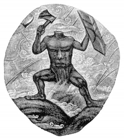 徐龙宝的《山海经》木刻插图具有饱满的精神意蕴。众所周知,中外各民族均从各自的神话中汲取精神与意志的力量作为文化的重要源头,神话人物在塑造民族性格方面具有特殊的作用。本书中的夸父、蚩尤、精卫、形天等神话形象,画家均赋予了昂扬的能量。如形天是中国神话中常被人提及的著名人物。据《海外西经》云:“形天与帝争神,帝断其首,葬之常羊之山,乃以乳为目,以脐为口,操干戚以舞?!毙鹗隽诵翁煊牖频壅髡奖豢诚峦仿?,埋在常羊山,但失头的形天以双乳为眼,以脐为口,继续持盾操斧,战斗不止。陶渊明曾在《读山海经》诗中赞道:“刑天舞干戚,猛志固常在?!闭庵植磺荒拥囊庵疽殉晌谢褡宓木裣笳鞫苋司囱?。徐龙宝所刻形天之像,脚踏巨石,肌肉暴突,血脉贲张,躯干上面色刚毅,蕴含了强大的正能量,比之古代的白描线条更具有令人振奋的张力,令观者能从中汲取鼓舞的精神力量。