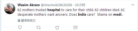 印度网友Wasim Akram:62个母亲相信医院会照顾她们的孩子,然后62个孩子就死了,62个绝望的母亲需要说法。印度在乎么?莫迪,你真丢人!