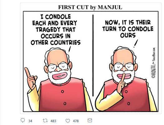 讽刺莫迪的漫画,“每一次别国发生悲剧我都会吊唁,现在轮到他们吊唁我们啦!”