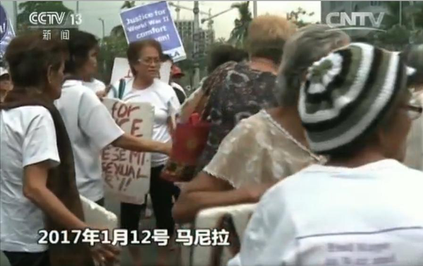 2017年1月12日,在安倍首相展开对菲律宾为期两天的正式访问之际,“慰安妇”幸存者举行游行抗议,要求日本政府为二战期间犯下的反人类罪行道歉、赔偿。