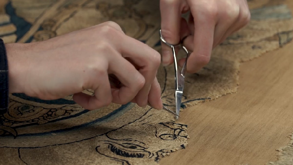 对于染料分析,大英博物馆的修复师们采用的鉴定方法是一种破坏性技术,所以每种颜色都需要截取大约0.5厘米长的纤维样本。修复师们表示,因为是破坏性的方式,所以需要对此非常小心?!安捎谜庵址绞绞欠窈鲜饰颐且埠凸莩そ辛颂致?。总之 我觉得采用这种方法对我们了解这件刺绣的作用,要远大于这一小部分样本的牺牲,”修复师Monique在直播时说道。