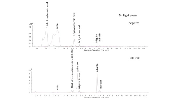 研究员Diego采用高压液相色谱质谱分析法分析最后萃取出的溶液。染料分子在机器里被分离后,得到的结果是一张图表。这张图表也被称做色谱图,图表上显示了不同时代的不同峰值,每一个峰值对应一个分子。研究员通过样本中得到的峰值和原先的参考数据库中的峰值进行对比后,得到一些信息。例如刺绣中的一种红色更像是从茜草而不是胭脂虫里提取出来的,又或是某种黄色是从哪株植物中提取出来的。