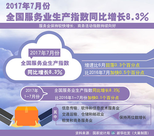 图表:2017年7月份全国服务业生产指数同比增长8.3% 新华社发 大巢制图