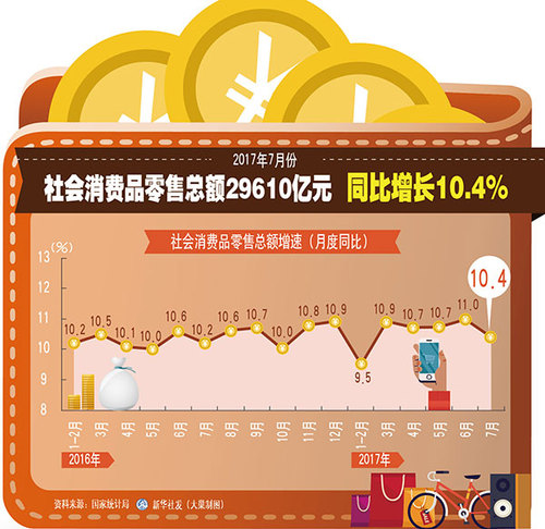 图表:2017年7月份社会消费品零售总额29610亿元 同比增长10.4% 新华社发 大巢制图