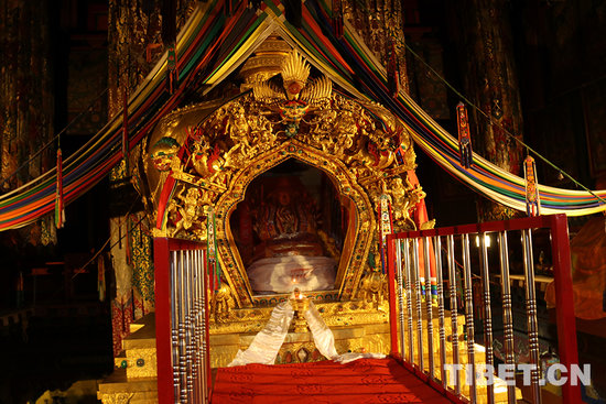 班禅大师在大金瓦殿宗喀巴银塔前诵经祈福。