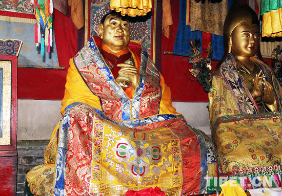 塔尔寺大经堂内十世班禅大师(左)等身像。