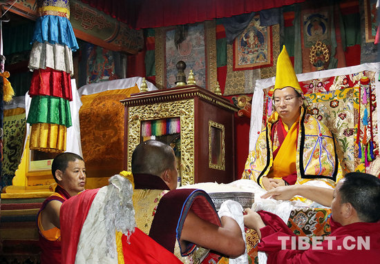 接着班禅大师来到塔尔寺著名的大经堂。大经堂是土木结构的藏式平顶建筑,是塔尔寺全部建筑中规模最大的,建筑面积近2千平方米,是拥有168根大柱的大型经堂,初建于明朝万历三十四年,即公元1606年。它是寺院僧人集中诵经的地方,堂内设有团垫,可供千余僧人集体打座诵经。这天上午,塔尔寺几乎所有的僧人都迎候在大经堂里,等候班禅大师讲经灌顶。班禅大师法相庄严地端坐在大经堂的中央法座上,边上就是按一比一比例复制的十世班禅金身像,墙上还挂着他慈祥庄严的相片。十一世班禅大师如法地进行祈福诵经活动,塔尔寺的僧人们按照仪轨向班禅大师献上象征佛身语意的各种供物,班禅大师也向僧人们布施。仪式的最后,大经堂内的僧人们都排队一一接受班禅大师的摸顶祈福,并得到像章、金刚结等护身符和纪念品。