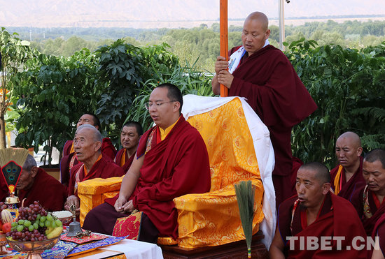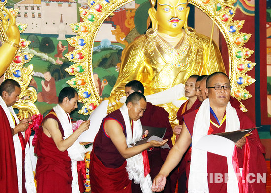 班禅带领僧众在“中华福运轮”前念诵祈愿经文。