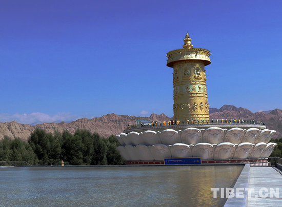 最后,班禅大师一行来到位于黄河岸边的“中华福运轮”,“中华福运轮”转经轮主体高42米,于2012年获颁吉尼斯世界纪录?!爸谢T寺帧弊毕蚰?,由黄河民俗博物馆、倒影池、转经塔三部分组成。班禅大师一行,背对着翻腾着青色波涛的黄河坐下,面对着“中华福运轮”,班禅带领僧众念诵祈愿经文,祈祷世界和平、国泰民安、五谷丰登、众生幸福。(中国西藏网文、图/袁星宇)