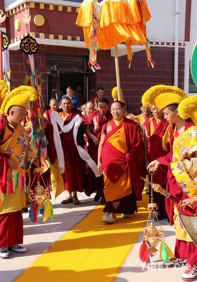7月21日,清晨5点多,车队来到位于青海西宁市湟中县静谧的塔尔寺。只见一位僧人穿着绛红色的僧装,走下车,这时早早迎候在塔尔寺门口的僧人仪仗队,鼓乐齐鸣,隆重欢迎这位重要的僧人——班禅额尔德尼?确吉杰布。