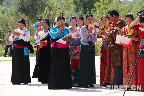 得到班禅大师纪念品和护身符的贵德县群众。(袁星宇)