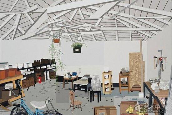在一张描绘画室的大幅作品当中,对天花板的处理可谓是一处惊喜,不过里面的留白非但不像是为了让欣赏者能喘口气而设计出来的,倒像是画家因时间不够而未完待续的遗憾。留白似乎一直都是伍德因来不及完成作品而不得已作出的选择,他那些盆栽题材的大幅作品也证明了这一点。
