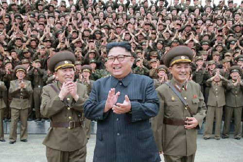 朝中社8月15日提供的照片显示,朝鲜最高领导人金正恩(中)14日视察朝鲜人民军战略军司令部。