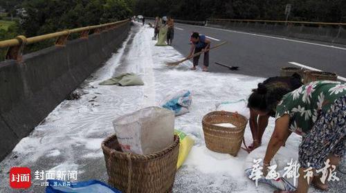 15日中午,一辆运输工业盐的货运车辆在行至成南高速遂宁段桂花互通时,车上工业盐口袋出现破损,散落长达400米。当地老百姓在帮忙清扫高速路面的过程中,偷偷将工业盐打包带回家中准备食用。